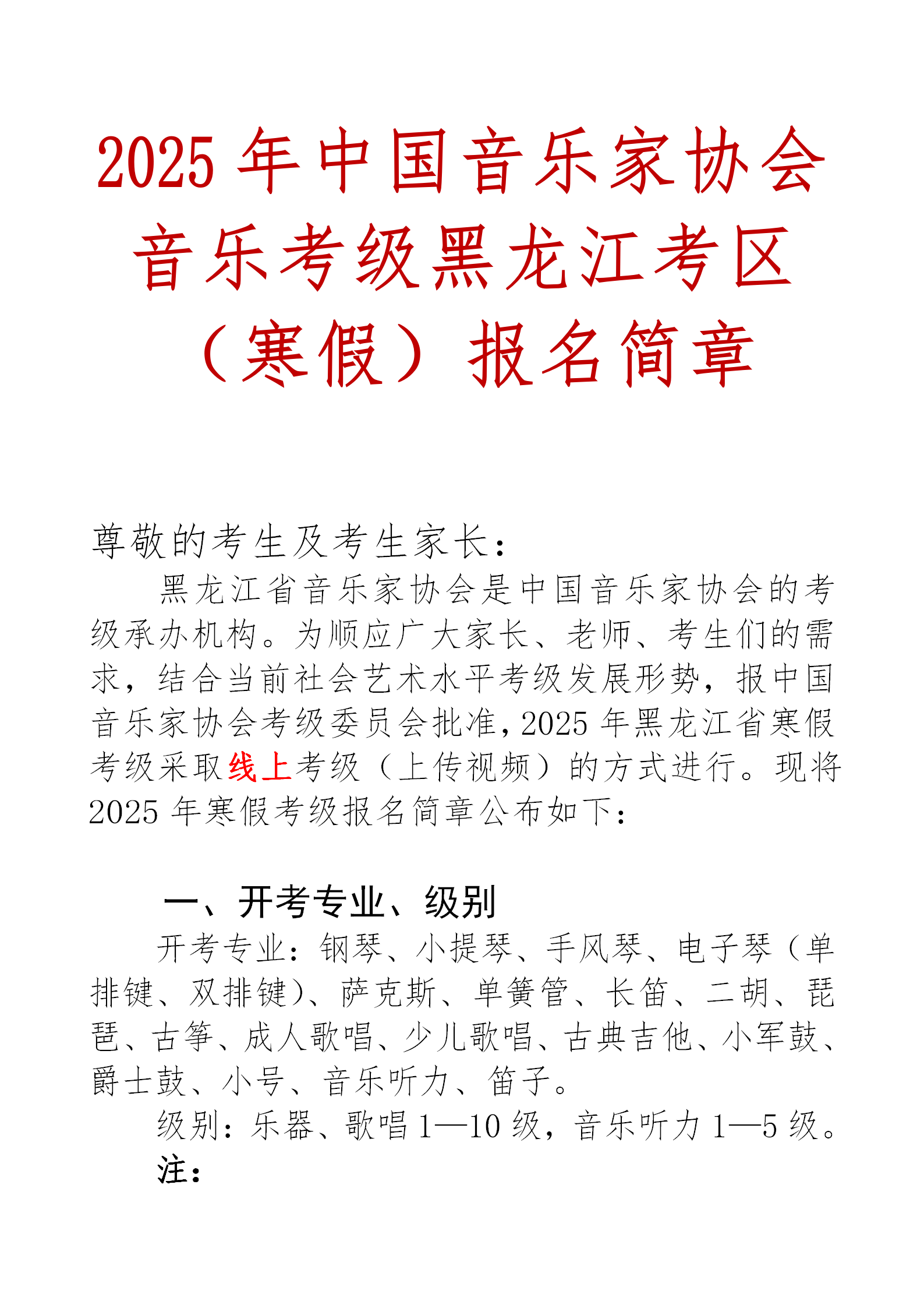 2025年中国音乐家协会音乐考级黑龙江考区(寒假)报名简章