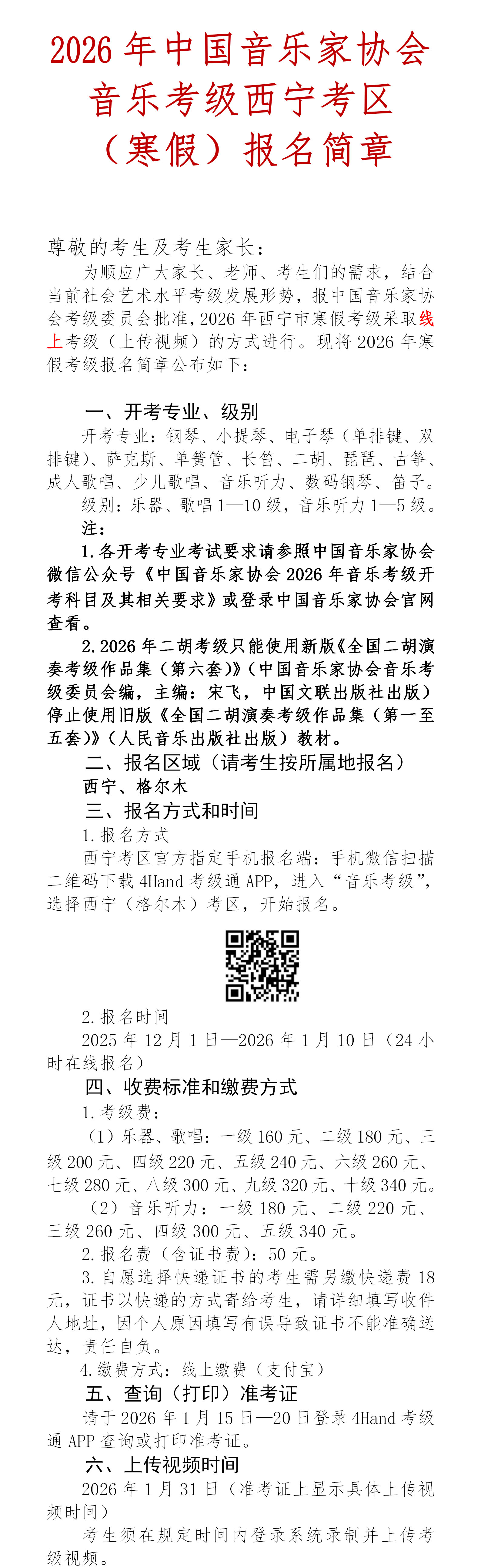 2026年中国音乐家协会音乐考级西宁考区(寒假)报名简章