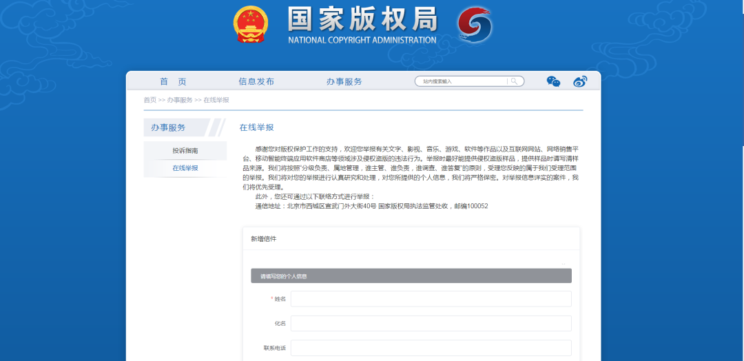现在,让我们来了解一下国家版权局官网“在线举报”版块吧。