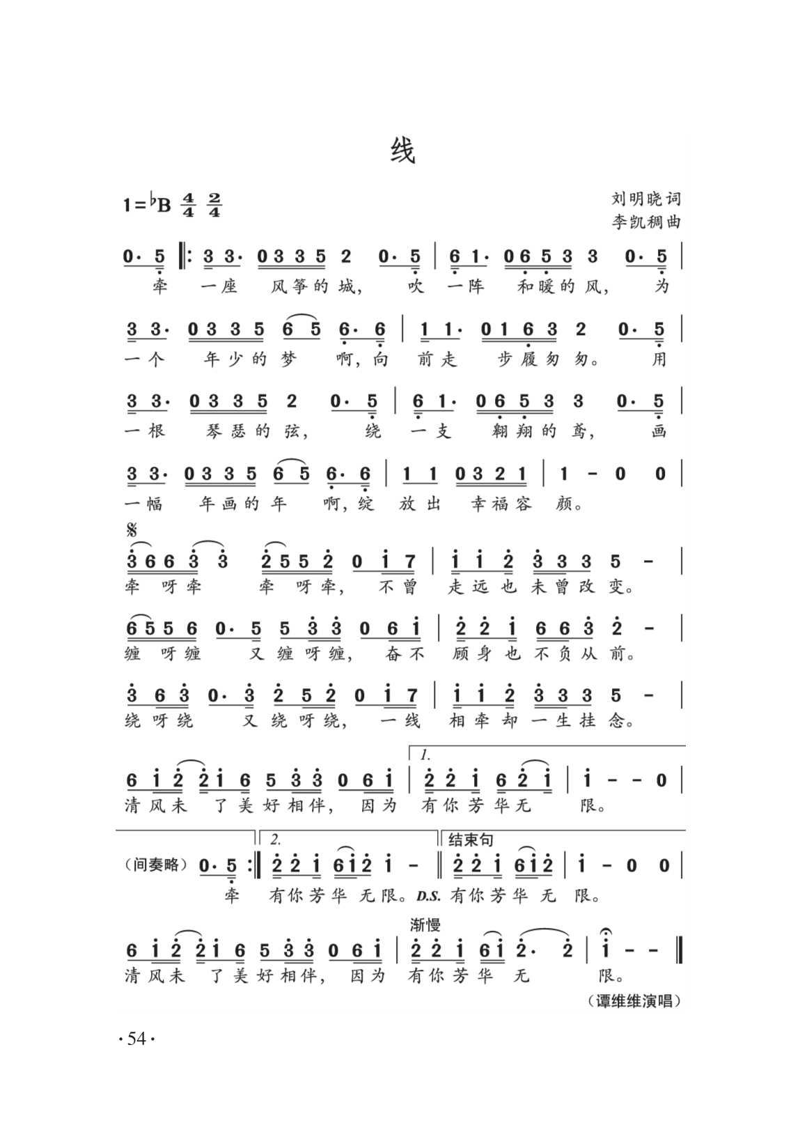 歌曲《线》是作者在历史文化名城、"世界风筝之都"潍坊采风调研后创作的作品。在对潍坊的历史文化风貌有了更深入的了解之后,词作者敏锐地捕捉到了一个创作切入点:在潍坊,扎制风筝用线、放风筝用线,诸城古琴、鄌郚吉他都有“线”,寿光蔬菜的地垄也是“线”……可以说,“线”就是这座城市最具共性、最有特点,也是最重要的符号。于是,歌词就以“线”作为关键词,来表现和展示城市的发展和温度。“牵呀牵,不曾走远也未曾改变;缠呀缠,奋不顾身也不负从前;绕呀绕,一线相牵却一生挂念。”歌词从具象到抽象,以与线相关的“牵”“缠”“绕”等动作联想,讲述着一个人与一座城千丝万缕的缘分,抒发了“清风未了美好相伴,因为有你芳华无限”的情怀。作品的旋律伴随着歌词缓缓流淌而出,或低吟浅唱,或高亢抒情,如同一座城将自己的故事娓娓道来,也如同一个人诉说自己如丝线般绵长而隽永的眷恋。歌手谭维维深情而大气的演唱风格,使这首歌曲具有独特的情感和力量,暖意直抵人心。