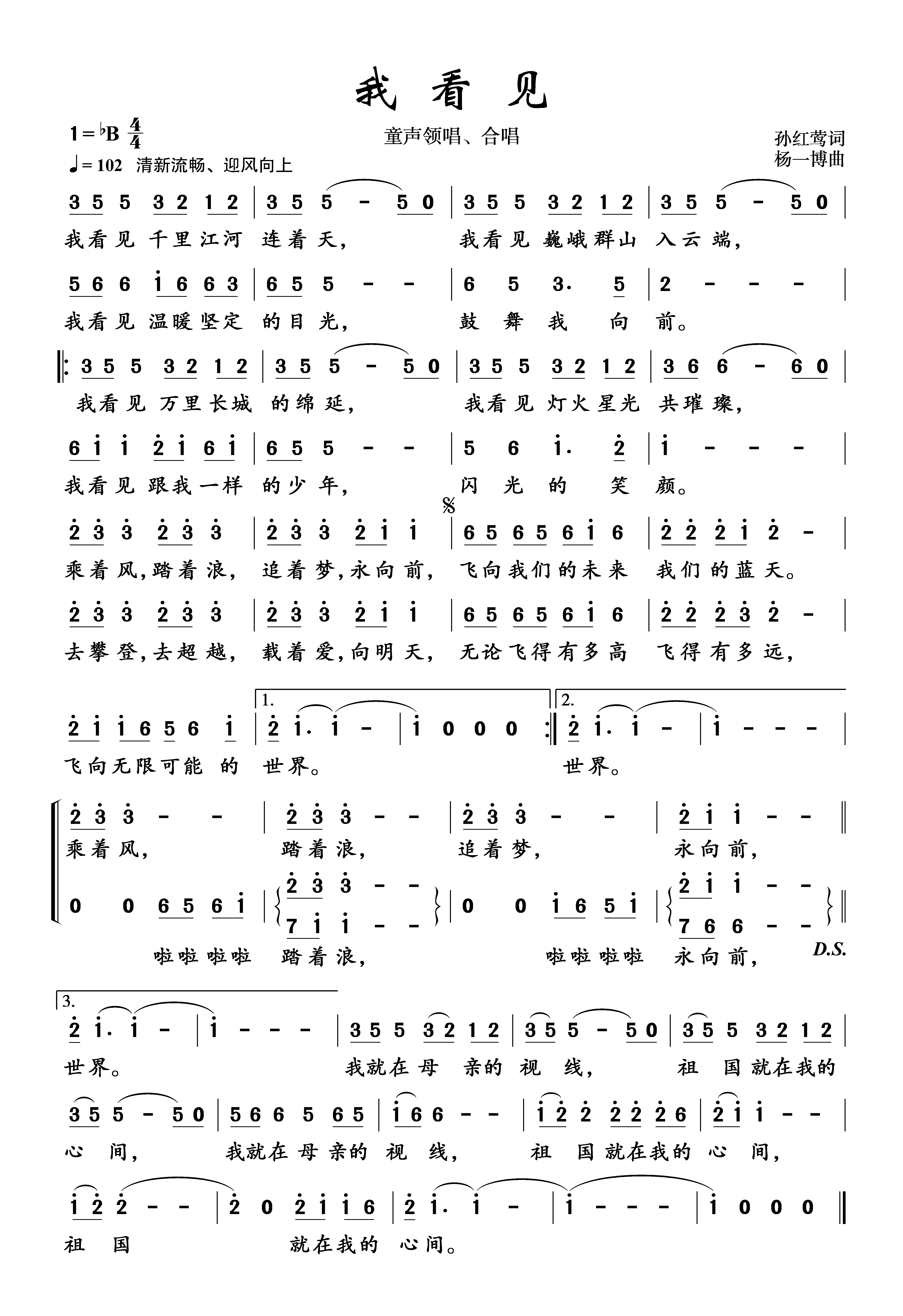歌曲《我看见》从孩子的视角出发,写出了新时代少年儿童的所见所思,以及他们心中的梦想。作品用甜美纯净的童声独唱作为开头,当明亮温暖的童声合唱缓缓进入,听众仿佛能随着歌声的指引,看见一幕一幕壮观的景物,也看见孩子们“乘风踏浪”奔赴美好未来的身影。歌词寓情于景,在“千里江河连着天”“巍峨群山入云端”“万里长城的绵延”“灯火星光共璀璨”的美景描摹中,融入孩子们对祖国的赞美之情和自豪之情,同时,他们因父辈“温暖坚定的目光”而深受鼓舞,奋勇向前、坚定信念,在追逐梦想的路上绽放出“闪光的笑颜”。歌曲旋律优美、朗朗上口、易于传唱,作曲家用时尚、细腻的音乐来抒写童真童趣和孩子的心声。该作品入选全国少工委“新时代 新征程”主题云队课,在2023年六一儿童节播出,当天收看人数达1300万人次。少年儿童是祖国的未来、民族的希望,歌曲《我看见》塑造了新时代少年儿童心中有祖国、心中有梦想的美好形象,突出展现了“育时代新人”的使命担当。
