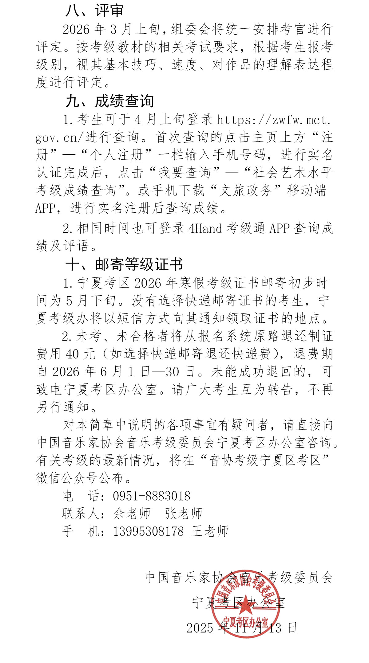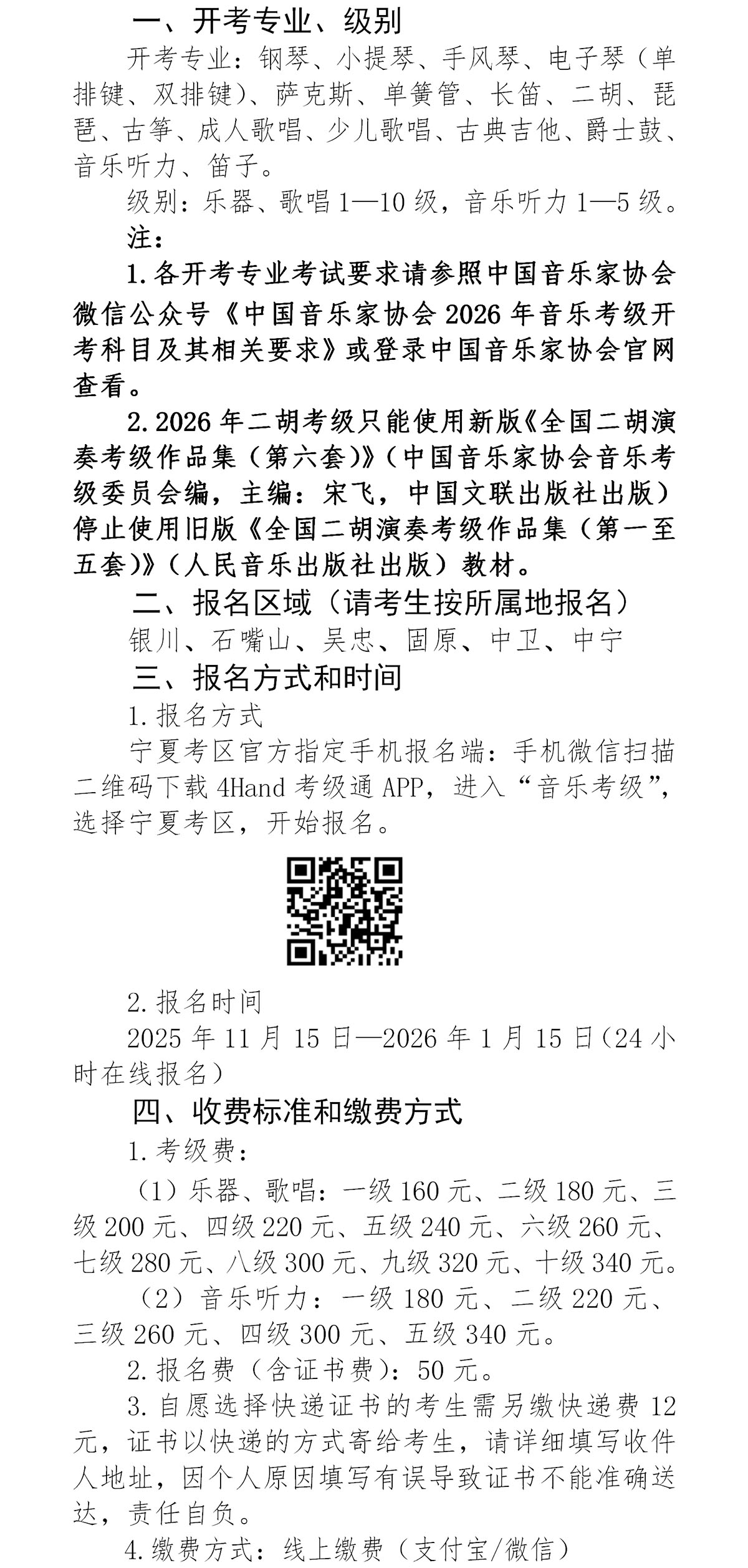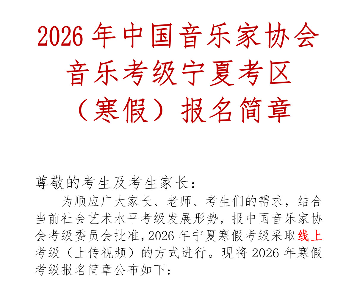 2026年中国音乐家协会音乐考级宁夏考区 (寒假)报名简章