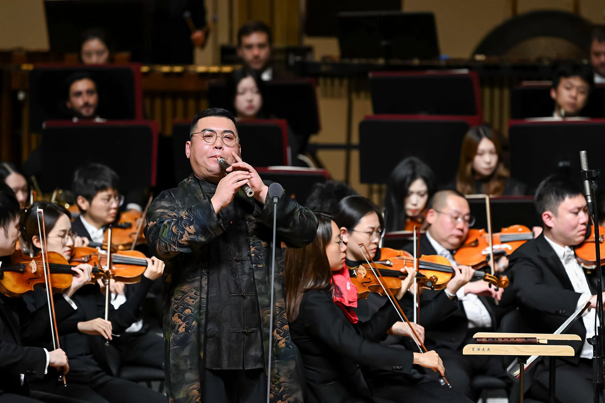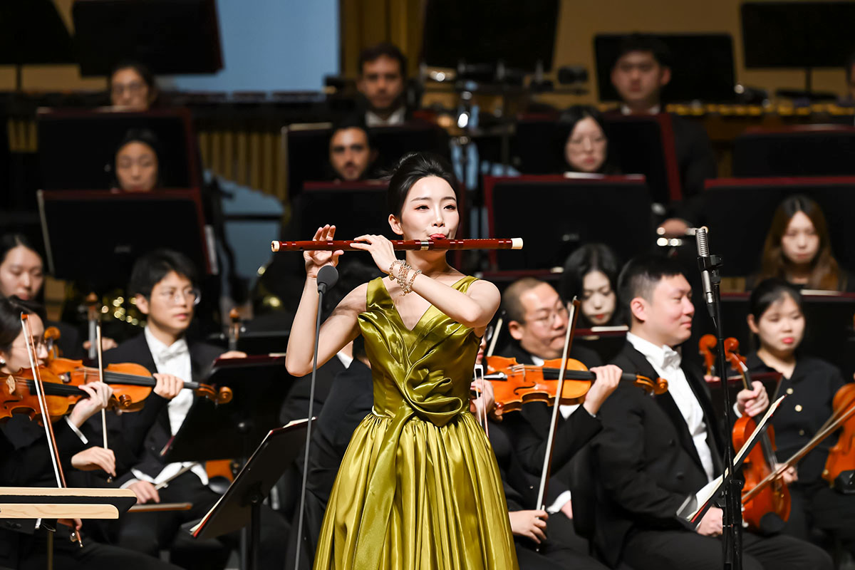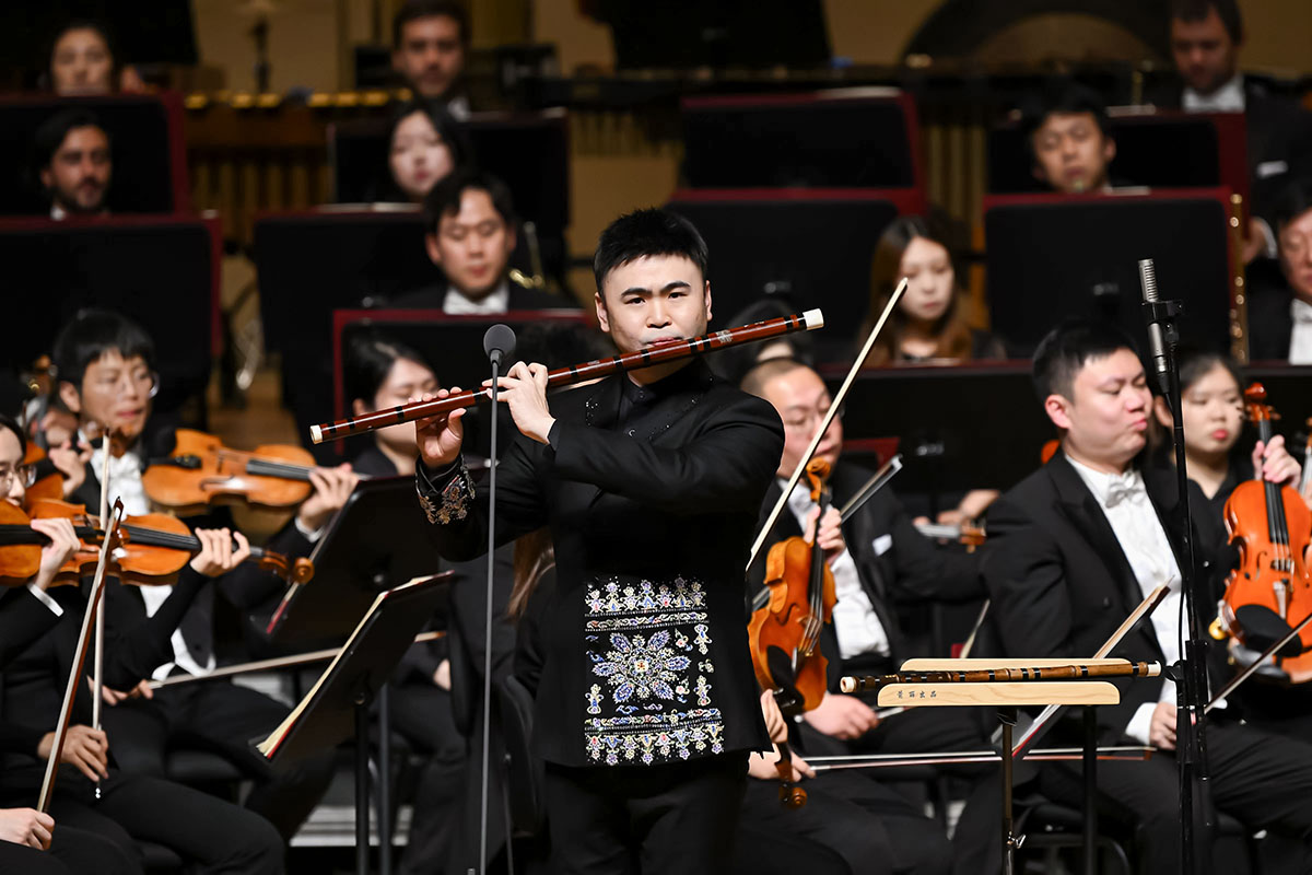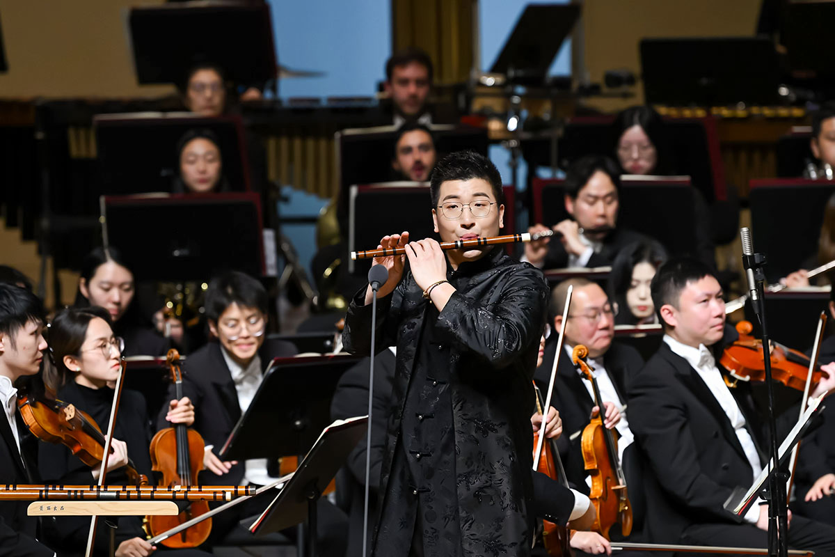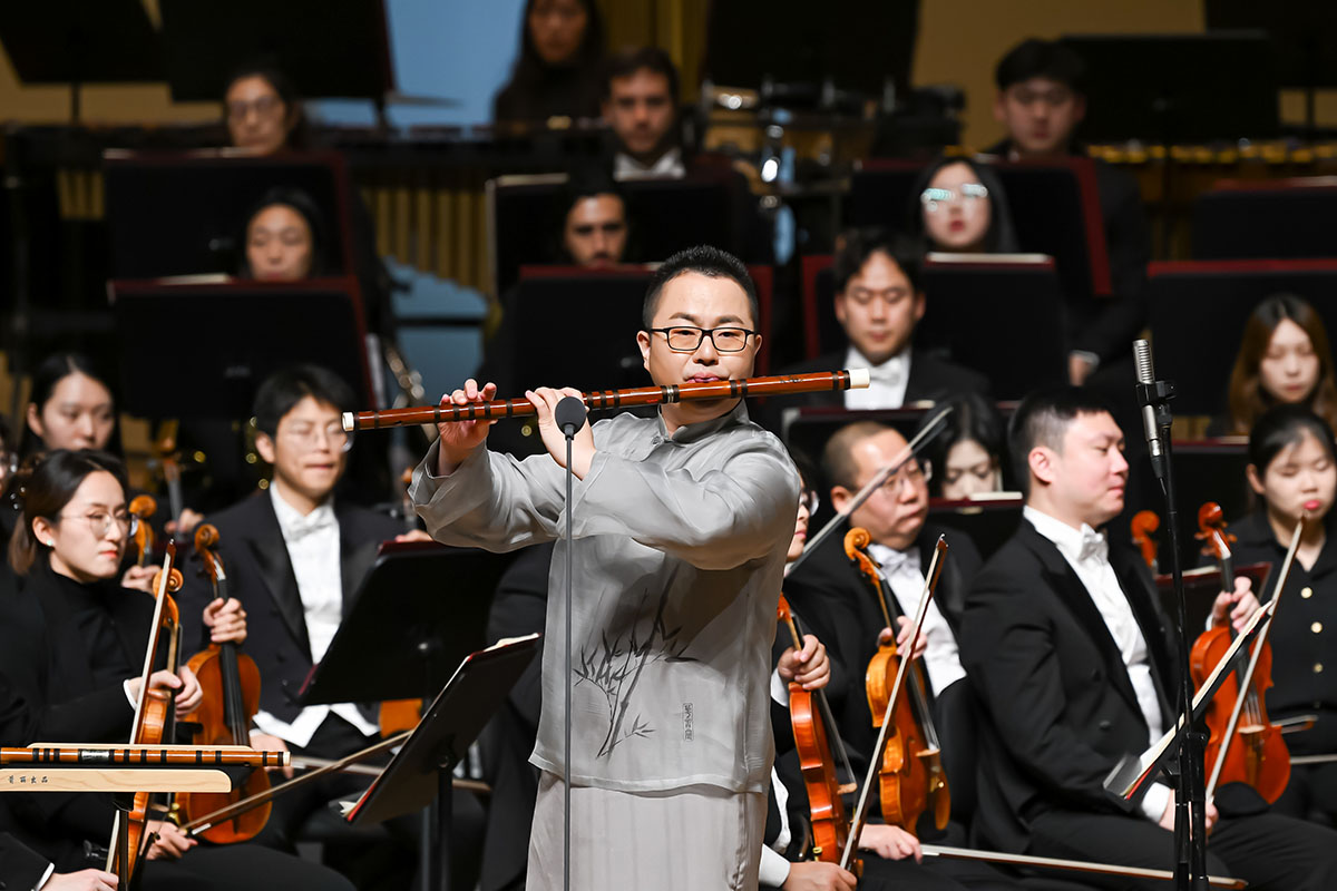 第一场音乐会的曲目编排兼具经典传承与创新表达,8 首民族管乐协奏曲涵盖竹笛、唢呐、笙、管子四大类乐器,既彰显不同管乐的独特音色魅力,又通过展现青年演奏家与交响乐团的默契配合,呈现出民族音乐与西方交响编制融合的多元风采。开场曲为竹笛协奏曲《后羿》,由青年竹笛演奏家张莹莹演奏;紧接着,青年笙演奏家郑杨带来笙协奏曲《江河万古流》(选自民族交响诗套曲《大运河》);随后,青年管子演奏家张佳理奏响管子协奏曲《余晖下的背影》;青年唢呐演奏家周艺翔带来唢呐协奏曲《遥远的呼唤》;青年竹笛演奏家范临风带来竹笛协奏曲《热情与冷漠的邂逅》;青年笙演奏家梁景然演奏笙协奏曲《川江号子》;青年唢呐演奏家刘雯雯带来唢呐协奏曲《大开门》(节选);最后,青年竹笛演奏家李乐以竹笛协奏曲《陌上花开》(节选)收尾。整场音乐会既有传统音乐的中正平和,又有青年一代的鲜活朝气与交响编制的恢弘气势,赢得现场观众经久不息的掌声。