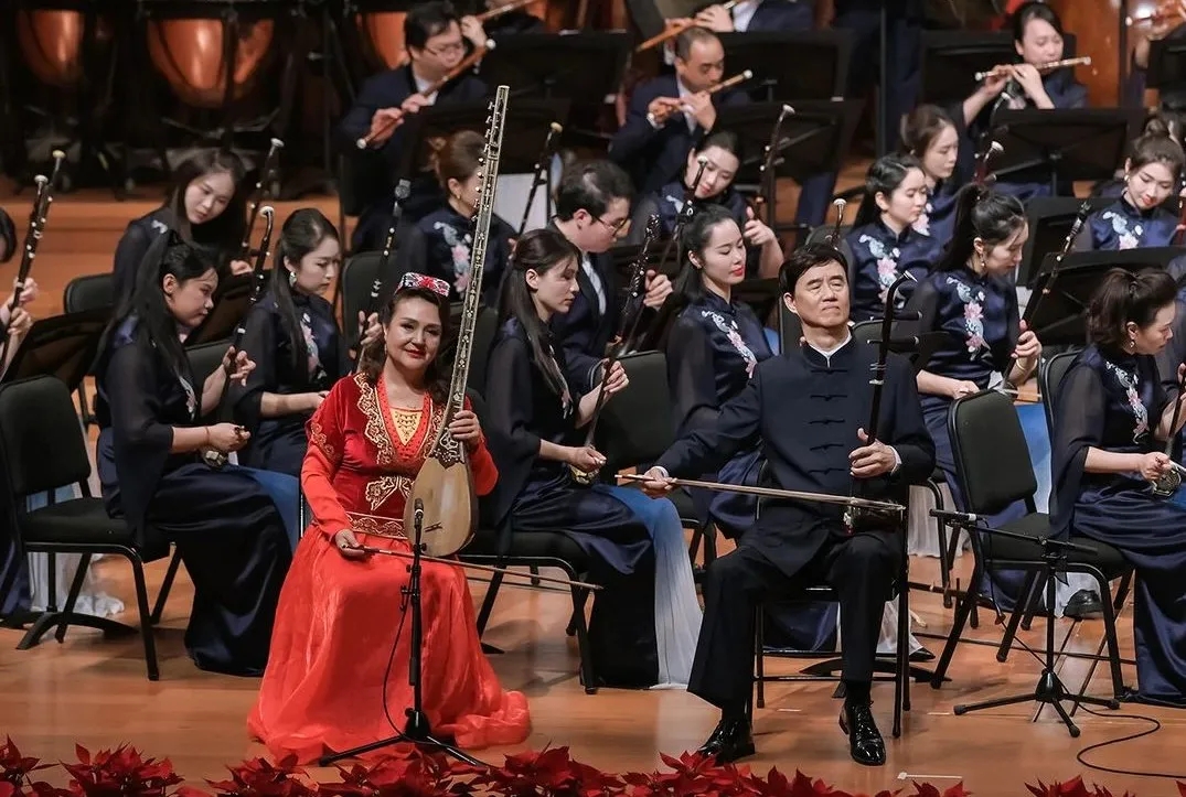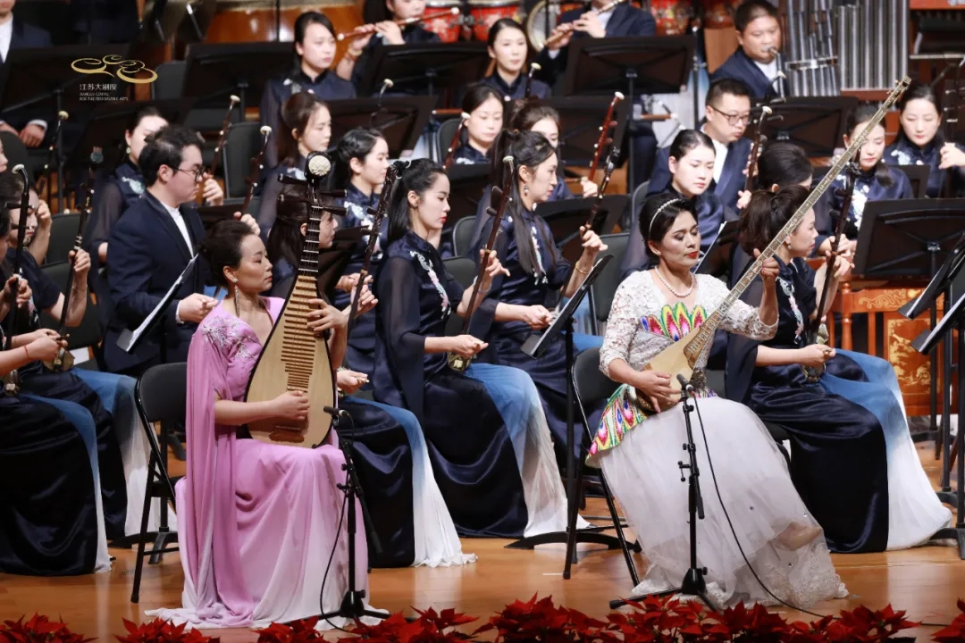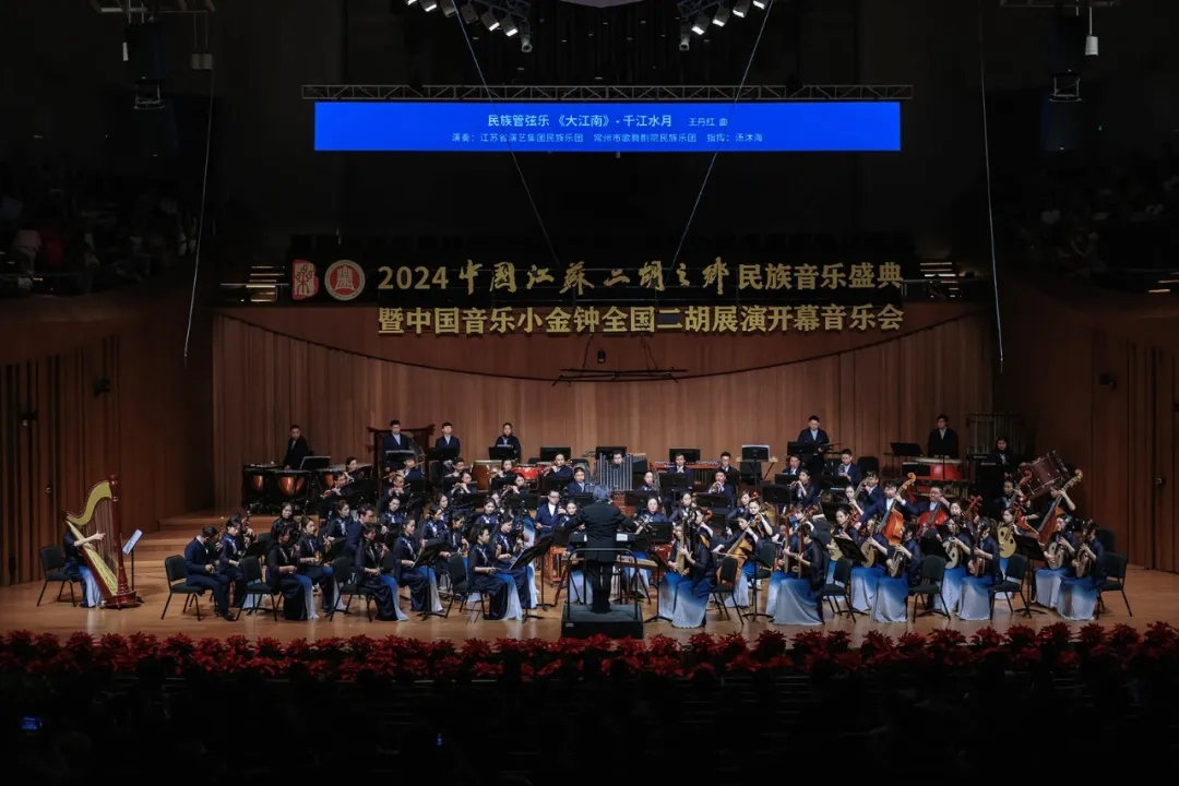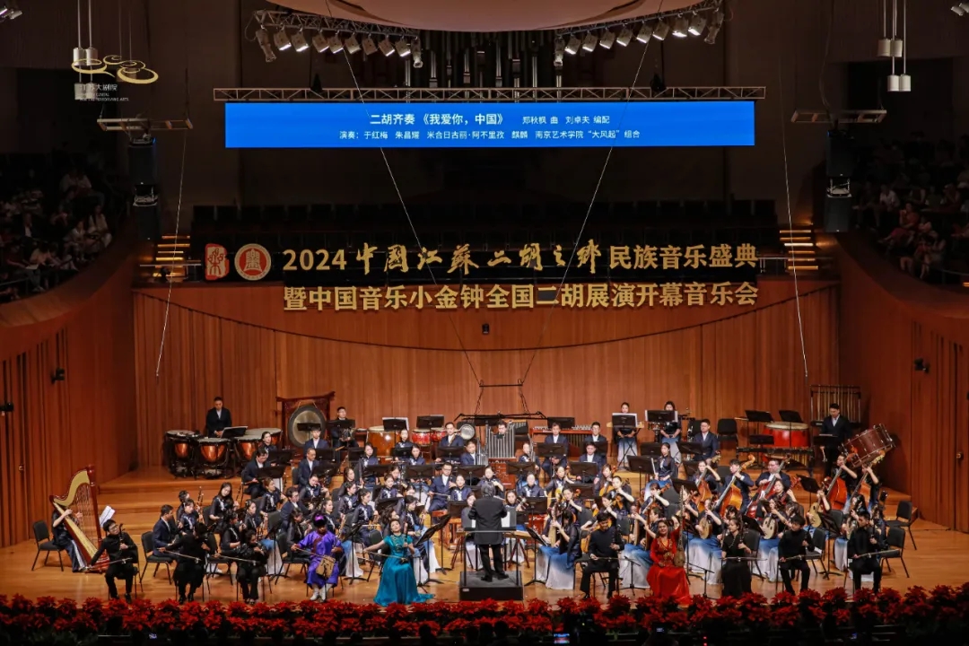演出开始前,中国音协分党组成员、副秘书长、一级巡视员王宏,江苏省委宣传部副部长徐宁,江苏省文联主席章剑华,江苏省文联党组书记、副主席、书记处第一书记常胜梅,共同启动了“2024中国江苏二胡之乡民族音乐盛典暨中国音乐小金钟——全国二胡展演”活动。音乐会上,指挥家汤沐海、张伟、努尔巴纳·依明,二胡演奏家于红梅、朱昌耀,琵琶演奏家吴玉霞,古筝演奏家王中山,竹笛演奏家戴亚,马头琴演奏家麒麟,新疆弹布尔演奏家买尔哈巴·努尔买买提,萨塔尔演奏家米合日古丽·阿不里孜,琵琶演奏家王琛等倾情献艺,为现场和线上观众们带来了一场精彩纷呈的民乐盛宴。音乐会曲目各具特色:民族管弦乐《大江南》用五个极具江南水乡特色的乐章书写了当代江南文化的心灵声响;《草原风光》让观众在悠扬婉转的马头琴声中重温草原的天籁之音;具有浓郁北派笛子演奏风格的《山野情》质朴醇美、热情奔放、富有鲜明的个性;琵琶、弹拨尔与乐队《楼兰意象》描写了古老楼兰的美丽、繁荣和神秘;《闹元宵》将元宵节的喧闹、喜庆气氛表现得淋漓尽致;二胡、萨塔尔与乐队《花儿为什么这样红》将传统民族乐器与西域音乐风格精致结合;《云想衣裳花想容》用优美的旋律和舞蹈性节奏展现了切切深情;《蒙山沂水情》带领观众一同走进了美丽的蒙山沂水,抒发了人们对沂蒙精神的崇敬……演出最后,一曲《我爱你中国》表达了所有人对祖国母亲的祝福。2024中国音乐小金钟——全国二胡展演由中国音乐家协会、中共江苏省委宣传部、江苏省文学艺术界联合会联合主办,中国音乐家协会民族弓弦乐学会、江苏省音乐家协会、中共常州市委宣传部、常州市文学艺术界联合会共同承办,旨在集中展示我国二胡艺术教育成果,为全国优秀青少年二胡人才搭建交流学习、展示才华、提升技能的舞台。
